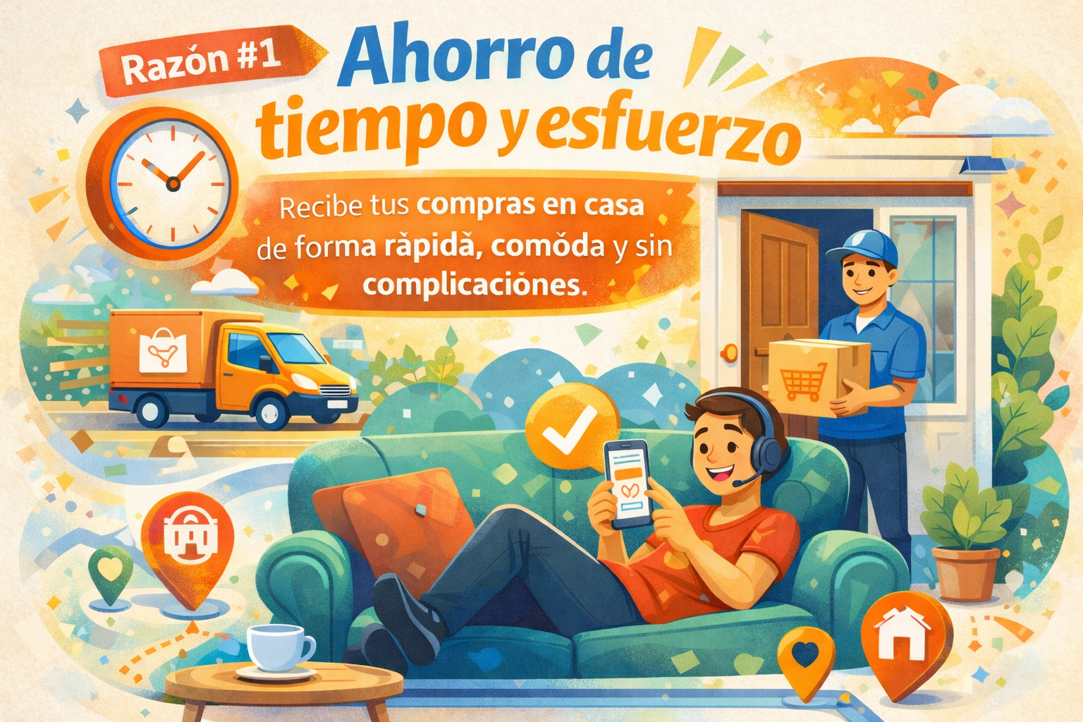 1️⃣ Comprar a domicilio te ahorra tiempo y esfuerzo. No necesitas salir, hacer filas ni perder horas en tiendas. Recibes lo que necesitas directamente en tu casa, de forma rápida, comoda y sencilla